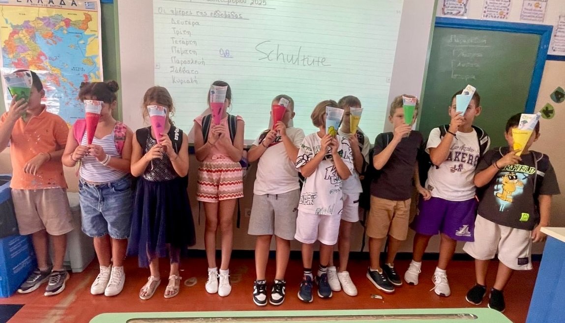 Στο πρώτο μάθημα της Δ΄ Δημοτικού, το Γερμανικό Τμήμα γνώρισε το όμορφο έθιμο της Schultüte – τον πολύχρωμο κώνο που γεμίζει εκπλήξεις και συνοδεύει κάθε νέο ξεκίνημα! Όλοι μαζί φτιάξαμε τις δικές μας Schultüten, γεμάτες χρώμα και χαμόγελα!